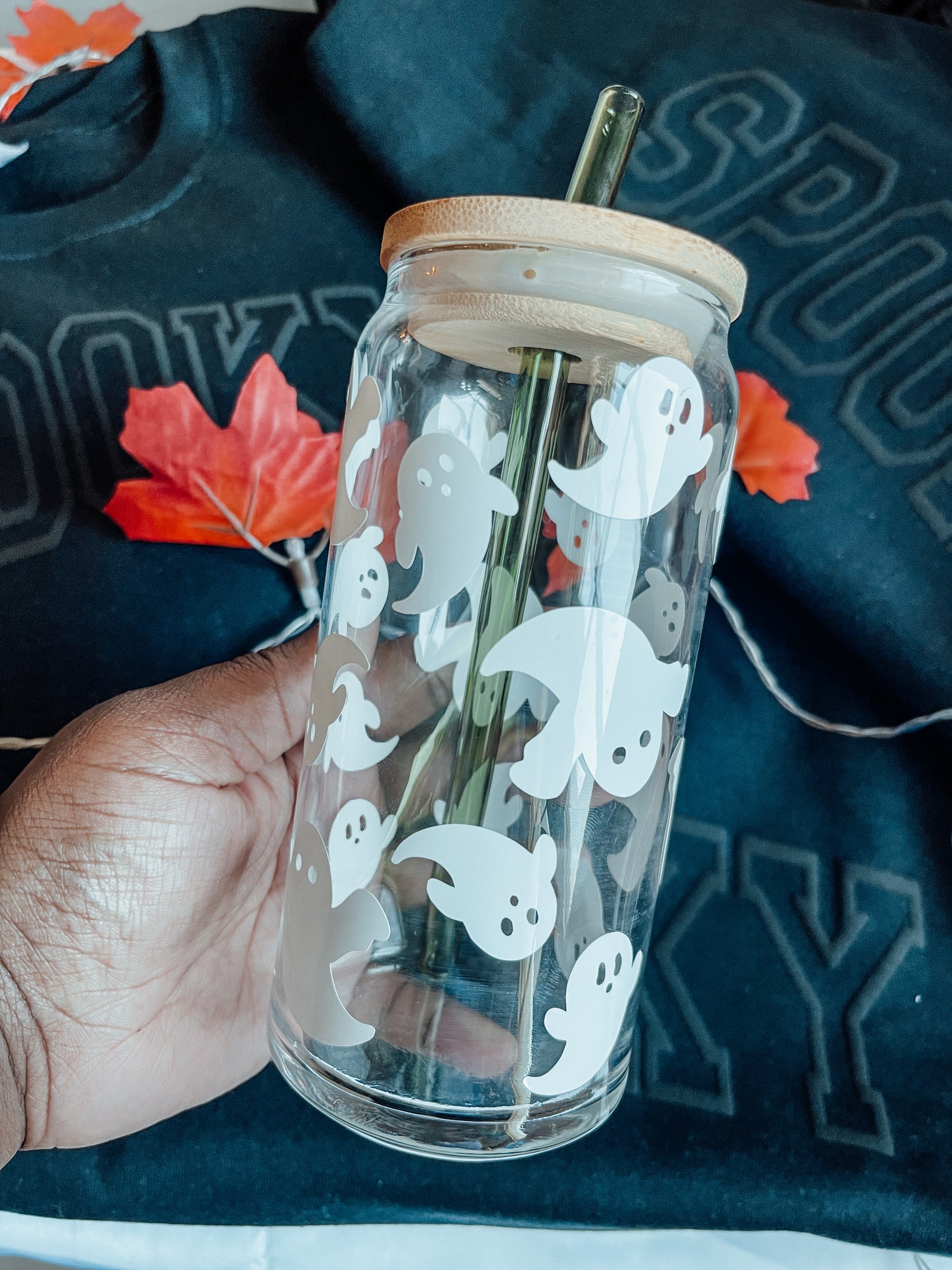 This 20 oz glass can is ideal for hot or cold drinks. Its ghost design provides a stylish, modern look!